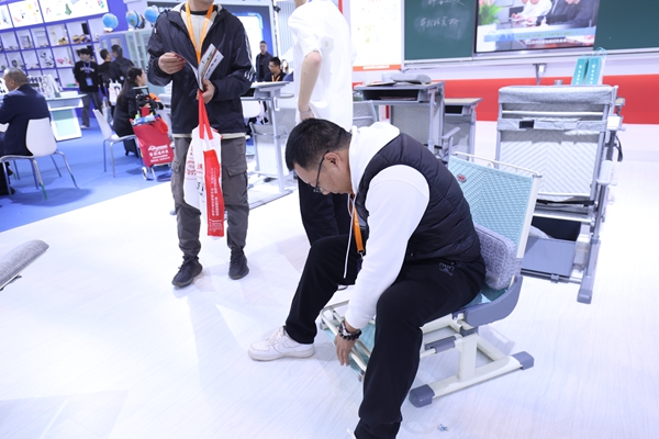 本屆展會,求展帶來“師生之友”午休課桌椅,它改變了傳統(tǒng)課桌椅固定的水平桌面,設(shè)計了桌面傾斜功能,輕輕一按,水平桌面就變成了傾斜桌面,操作簡單安全,如此一來桌子即可變形為學(xué)習(xí)桌、考試桌、畫桌、躺板等多種模式。桌椅還可自行調(diào)整高度,根據(jù)學(xué)生的不同身高情況,調(diào)整到適合的高度,改變了傳統(tǒng)課桌椅高度不能調(diào)節(jié)而無法匹配學(xué)生身高的弊端,課桌椅高度與學(xué)生身高的匹配,能夠有效避免了學(xué)生不良坐姿,呵護(hù)脊椎的健康發(fā)育。