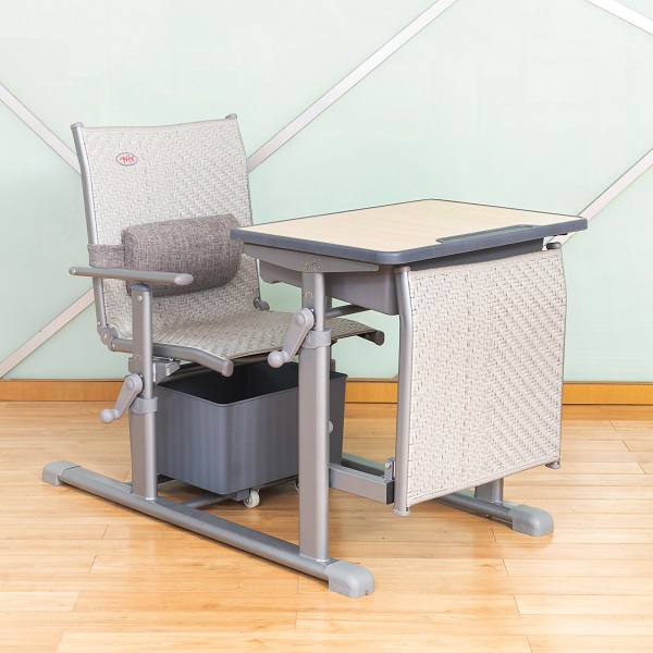 4、課椅規格及材料:460mm*380mm*(座椅面高360mm-460mm可手搖升降調節)±5mm,椅背可調最大傾斜度150°。座靠面料采用符合出口標準,沖擊100KG,靜壓180KG,60分鐘無損,抗紫外線不褪色,使用壽命8年以上的環保PE藤條。藤條規格為寬7.5mm±0.05mm*厚1.2mm±0.02mm,滕面邊沿采用PE材料包邊,尼龍線縫紉固定工藝。椅下設置370*330*190mm±3mm的PP材料的貯物箱,貯物箱底下前部設置雙滑輪,后部設置滑塊,與課椅下雙滑軌(ABS材質,規格315*30*20mm)的卡位裝置結構配合,貯物箱可前后自由限位滑動,可脫卸。