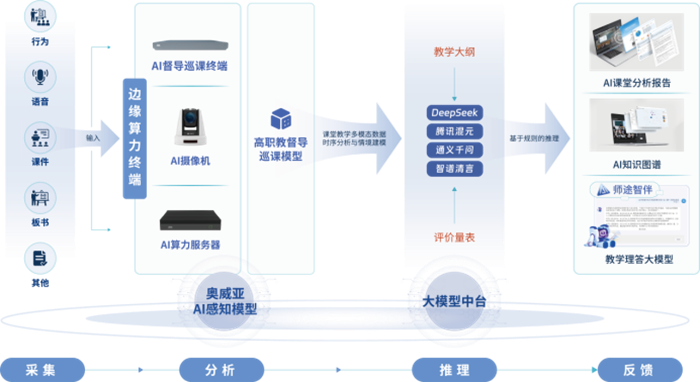 在應用價值方面,系統深度整合DeepSeek、騰訊混元、通義千問等主流大模型,具有強大的推理能力。基于奧威亞AI感知模型提供的多模態數據,輸出更精確的課堂評價和改進建議,構建起教育教學“全息數據采集-智能證據挖掘-動態策略生成-教學實踐提升”的閉環體系,為課堂教學質量評估、整改和推優提供新路徑。