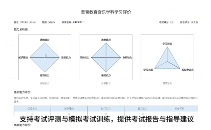 學生做完后,AI會立即批改,生成測評數據分析報告,并提供指導建議,報告包括對演唱、演奏、聽辨、知識理論等多項能力的分析,這種即時反饋讓教學有的放矢,也讓學生的學習更加高效。