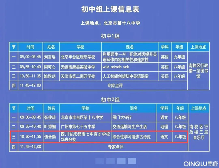 本次現(xiàn)場展示的32節(jié)課例,從全國推送的412節(jié)課例中遴選出來。四川省成都市七中育才學(xué)校華興分校伍永勤老師帶來的《綜合性學(xué)習(xí)漫步古詩苑》展示課是四川省唯一的一節(jié)初中展示課。課程融合了智能紙筆技術(shù)、AI大模型等工具賦能語文創(chuàng)新教學(xué)。
